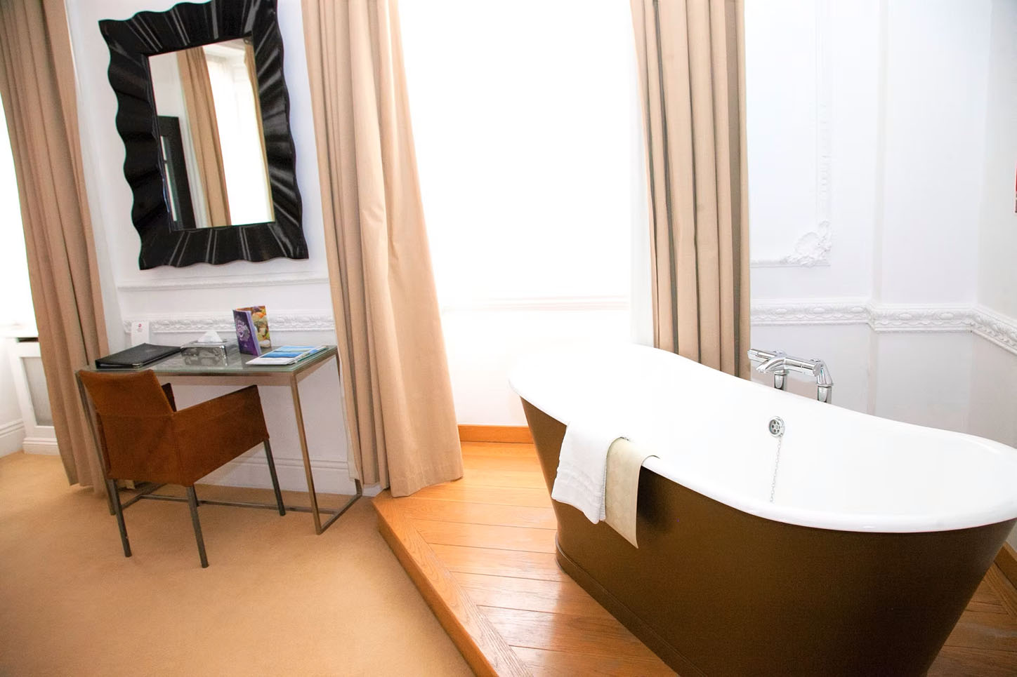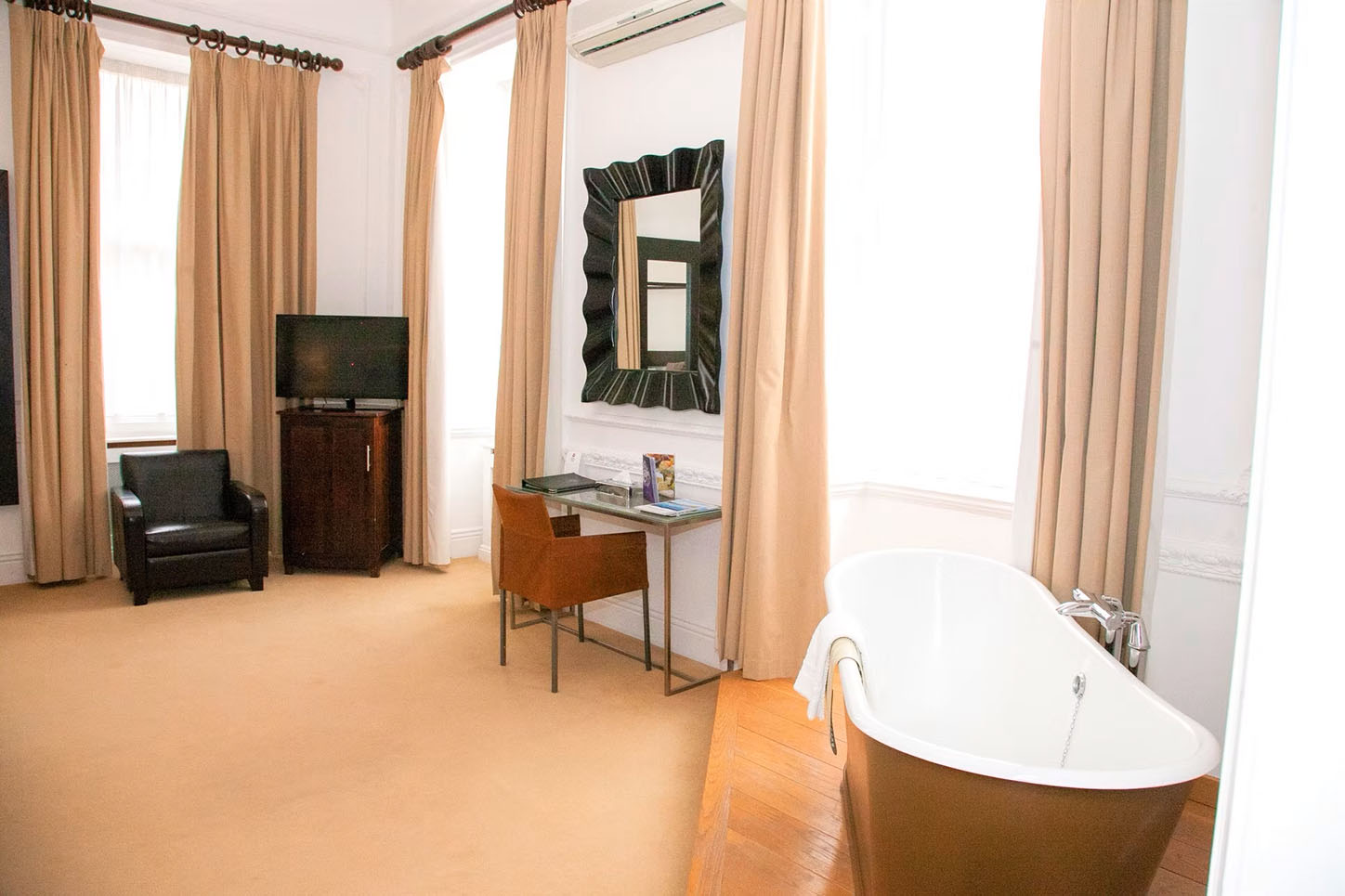 Every room also includes cozy beds, wardrobe space, tea and coffee facilities, hairdryer, iron and ironing board, desk and chair, flat-screen TV, telephone, dressing gowns, bespoke toiletries, a safe, and an en-suite bathroom or shower room, each with its own unique character.